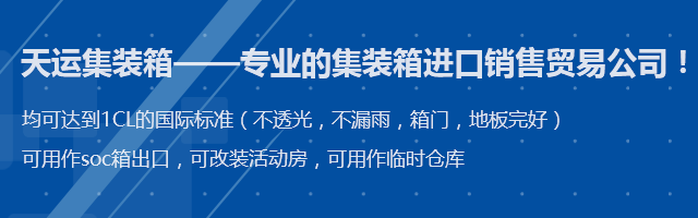 青島天運(yùn)集裝箱服務(wù)有限公司,是專業(yè)的集裝箱進(jìn)口銷售貿(mào)易公司,公司與各大船公司租箱公司保持著密切的合作關(guān)系,箱源充足,所有出售集裝箱均可達(dá)到IICL的國際標(biāo)準(zhǔn)(不透光,不漏雨,箱門,地板完好)可用作soc箱出口,可改裝活動房,可用作臨時倉庫。
